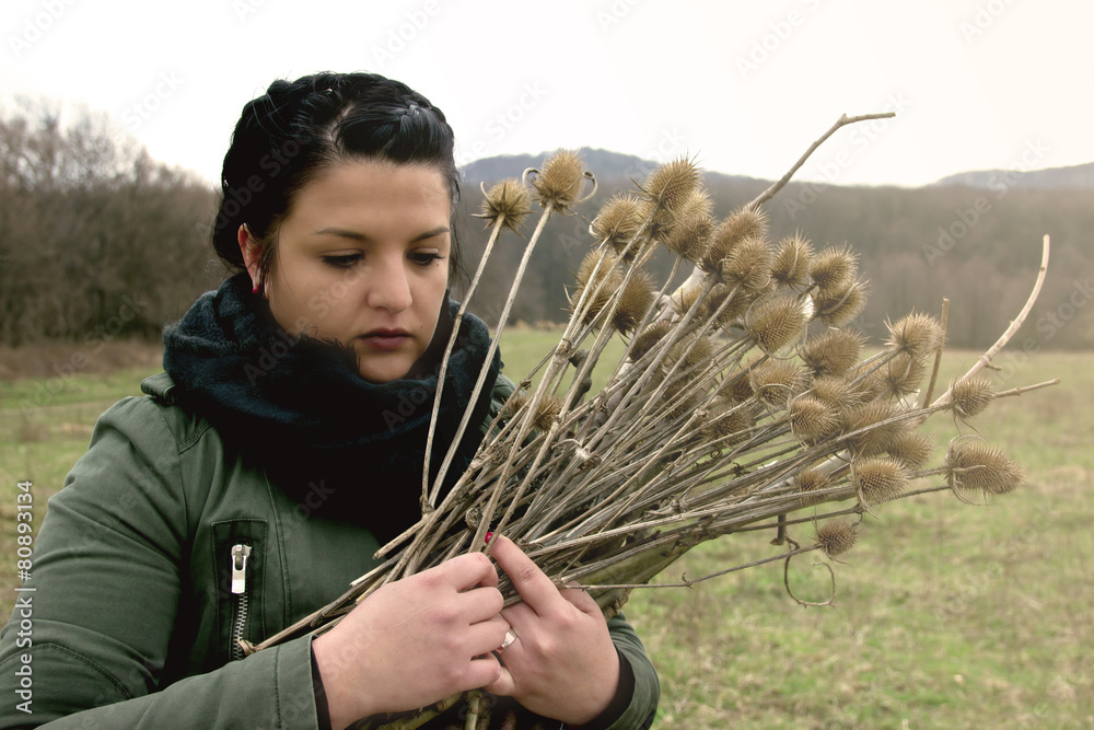 Sad Woman with Bundle of Flowers