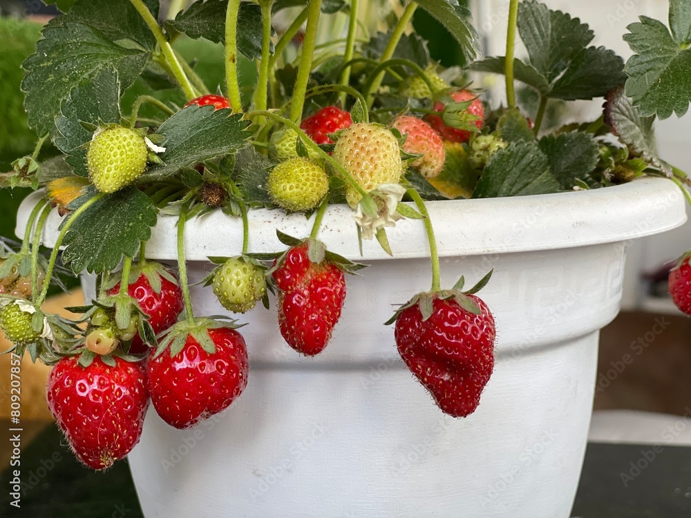 Strawberry growing in a box. Flowering strawberry plant in flower pot hanging on balcony.