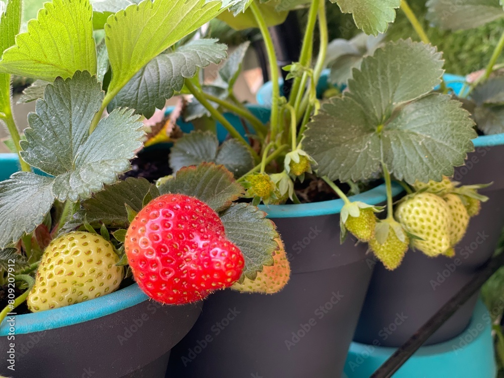 Strawberry growing in a box. Flowering strawberry plant in flower pot hanging on balcony.