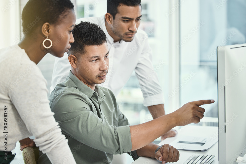 Business people, meeting and intern training with computer for information, research and growth. Corporate group, teamwork and technology with communication for employee onboarding and introduction