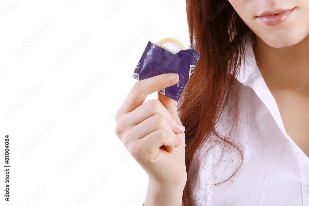 young woman with a condom (white background)