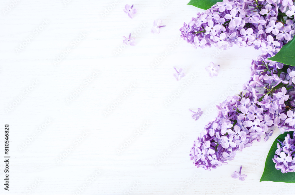 Lilac Flowers and petals on white wooden background, copy space. Beautiful Spring Flowers. Floral background for Birthday, Spring Holiday, Mother's day, Women's day, Wedding. Flat lay, top view