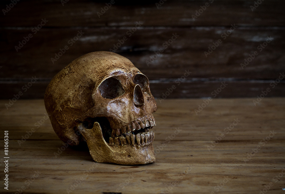 Still life.Skull resting on the old wooden floor.