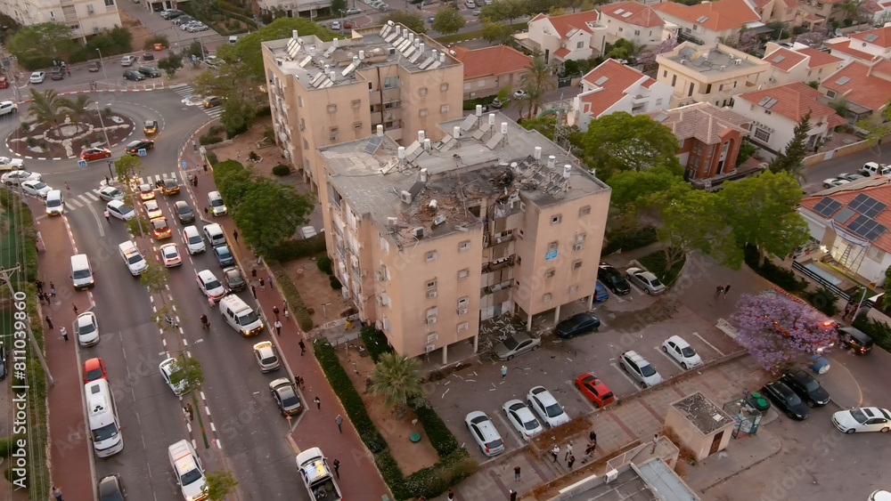 Building rooftop destroyed by Hamas Rocket, Israel,Aerial view