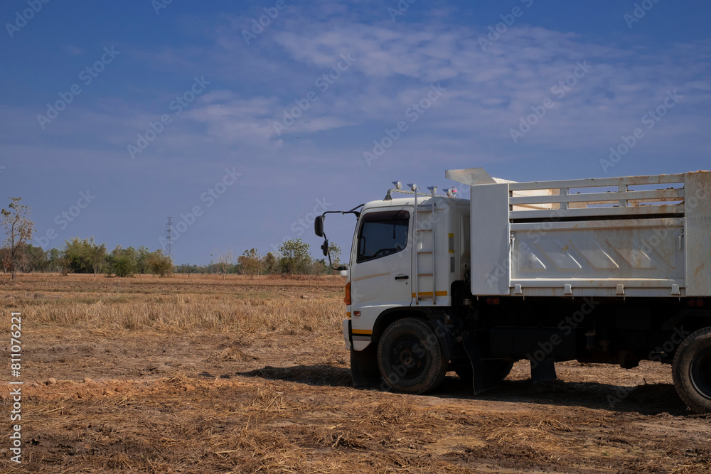 Tipper truck dumps its load of soil on a new road. Dump Trucks at a road construction site.
