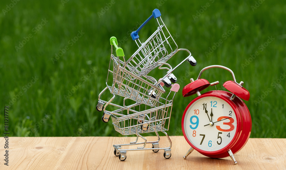 Miniature shopping cart from a supermarket and alarm clock on a background of grass