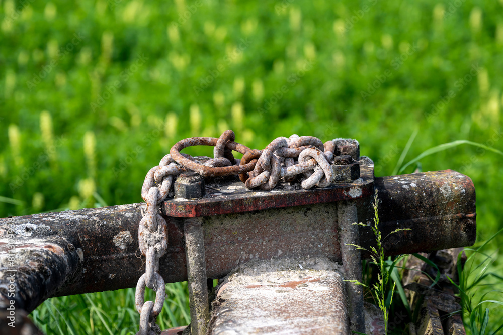 chaines rouillées posées sur un engin agricole rouillé également en extérieur dans un champs