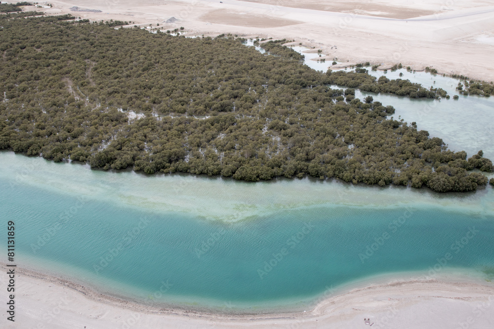 Vue aérienne de la mangrove d'Abou Dabi : entre dunes de sable et écosystème préservé