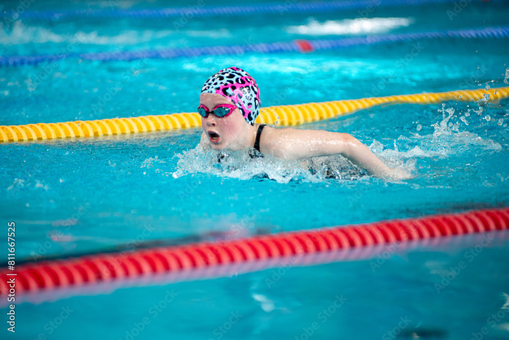 Swimmer girl swims butterfly swimming style in the pool