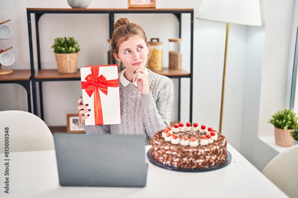 Thoughtful young blonde woman celebrating with a gift, sitting at home expressing serious face, her hand on the chin, deeply engrossed in a question, doubts clouding her conviction