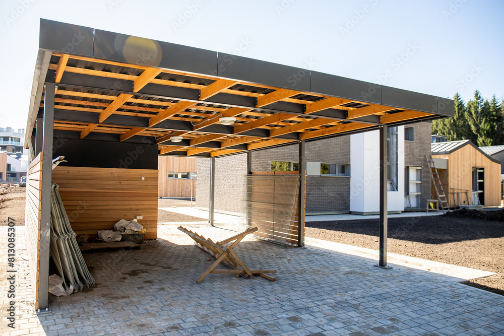 construction parking for cars on the background of residential premium houses in the Scandinavian style against blue sky