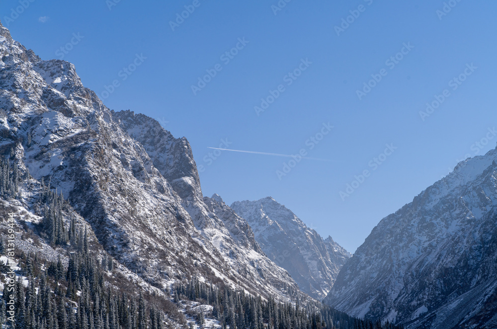 High flying plane in the blue sky, over a snow-covered canyon of towering rocky mountains, with a snowy coniferous forest of blue spruces down in the canyon.
