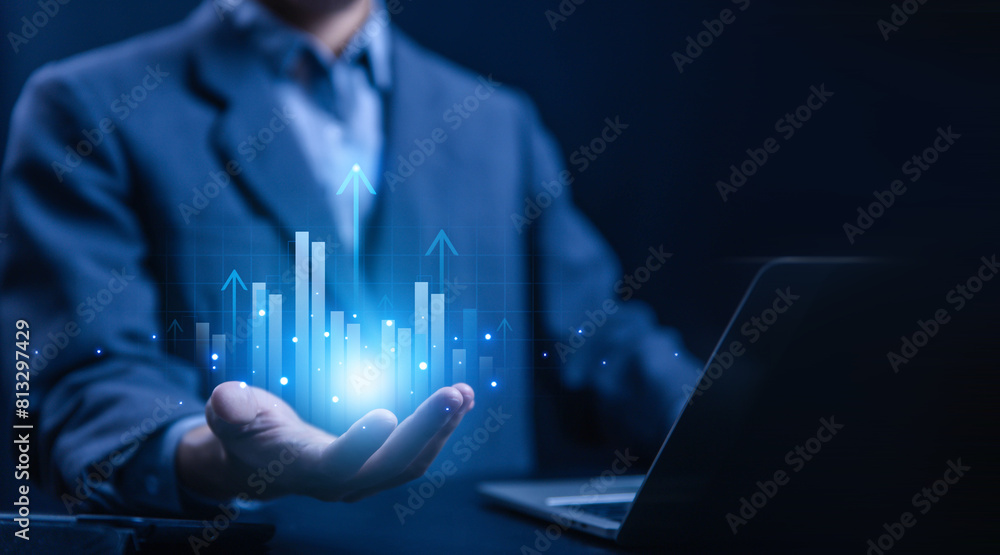 hand show graph chart stock market economic. growth business concept. plan strategy company increase profit to success global. trend marketing grows technology digital. economy, financial, and invest