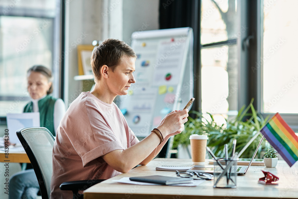 Dedicated woman engrossed in work, with phone, with her colleague on backdrop.