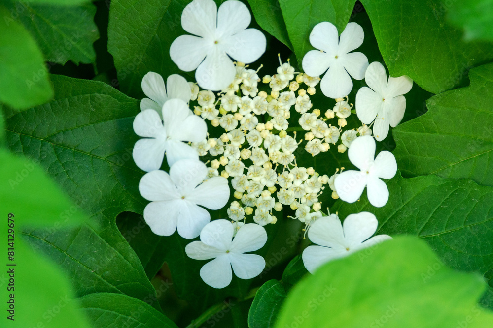 A cluster of white Viburnum opulus flowers against a background of green leaves.