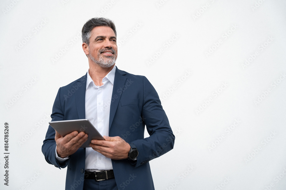 Middle age mature businessman using pc tablet for business work application. Smiling handsome older man in formal suit holding touchscreen device looking aside. Isolated white background, copy space
