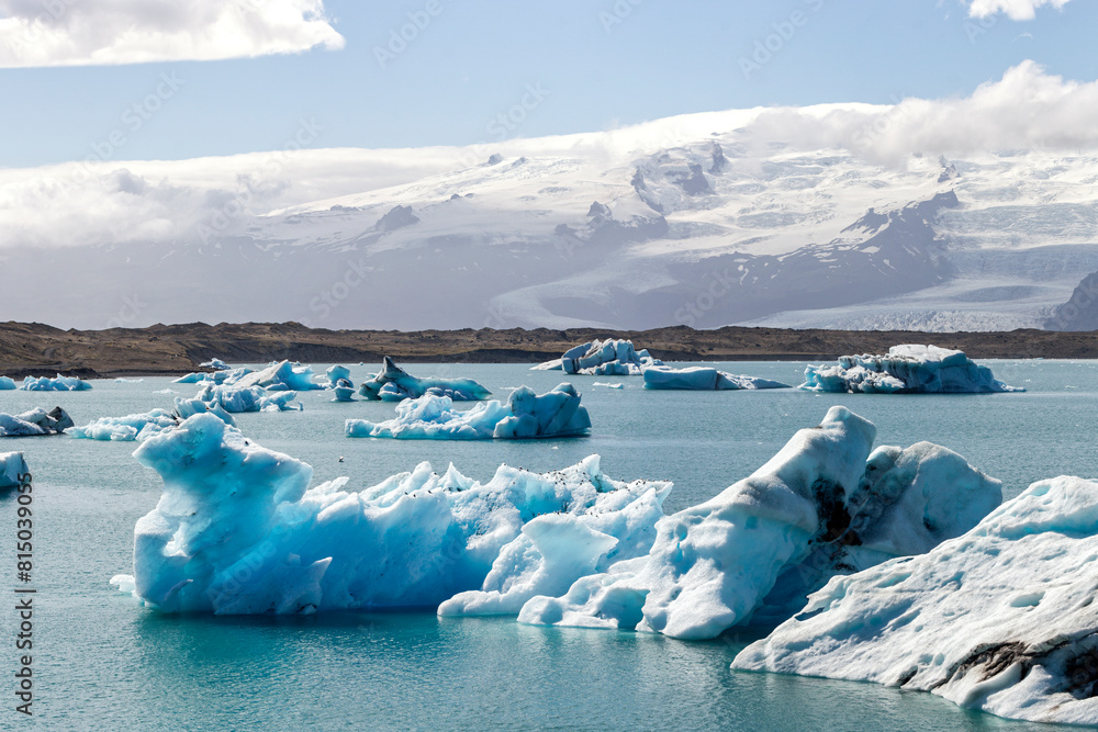 a stunning panoramic view over the unique breathtaking and iconic Jökulsárlón lagoon lake in iceland. With big icebergs on the water.