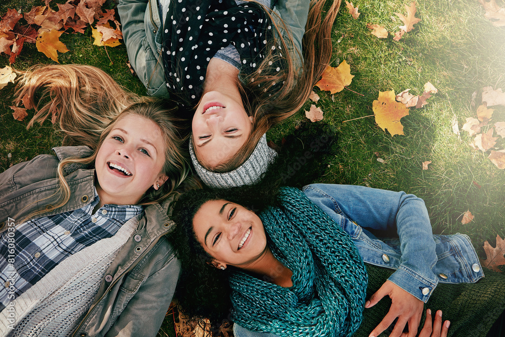 Above, teenagers or girls on park for autumn, relaxing and bonding together on grass with happiness. Nature, lawn and friends on summer holiday for chilling, hanging out and laugh outdoors with smile