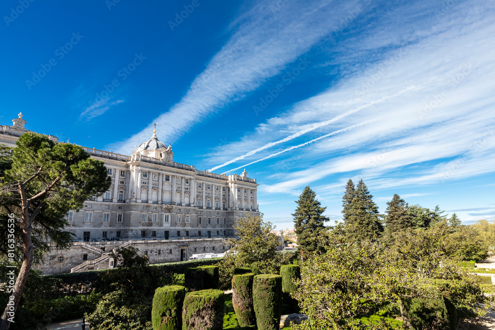 facade of Royal Palace of Madrid and Sabatini gardens, Spain
