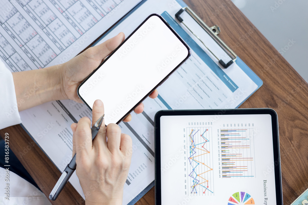 Woman holding smart phone with blank copy space screen for your text message or your content, Woman reads the text on the smartphone at the desk