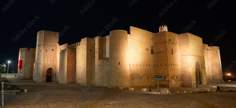 Beautiful view of ancient Ribat fortress in evening. Tunisia, Monastir, Africa. Mediterranean Sea