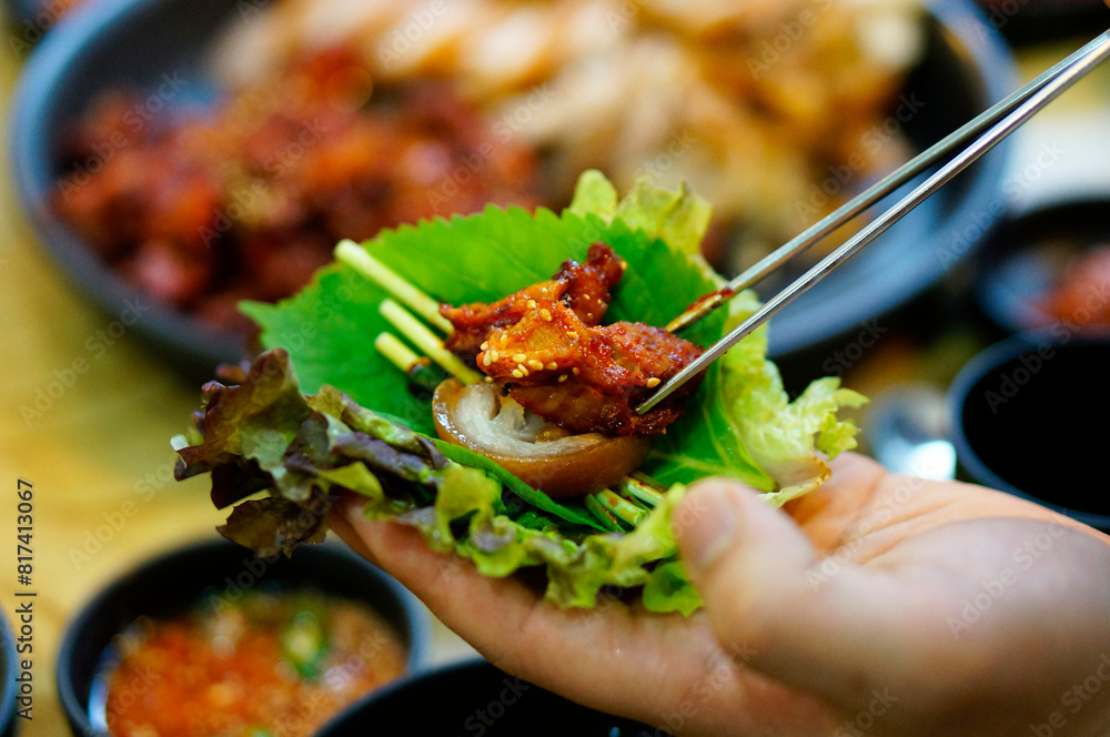 식탁 위에 플레이팅 된 족발을 쌈싸서 먹는 모습