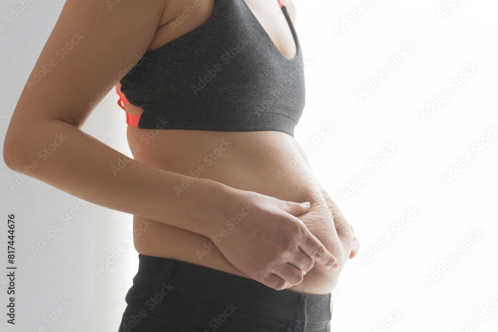 A fat Asian woman in black pants pinches fat folds on her belly with stretch marks after childbirth.