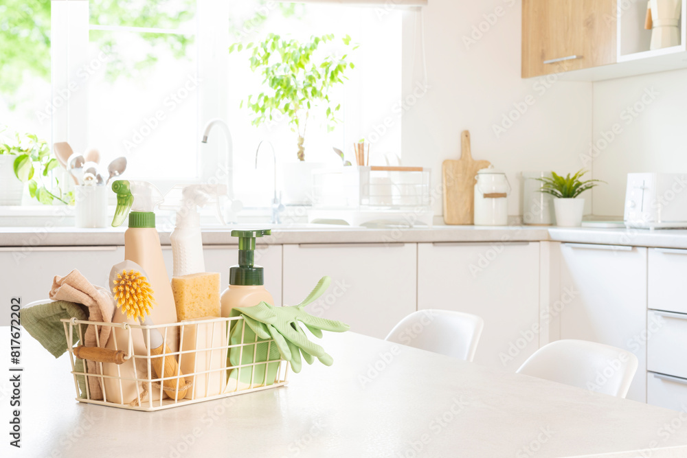 Various eco cleaning products in basket on table with blurred kitchen interior as background
