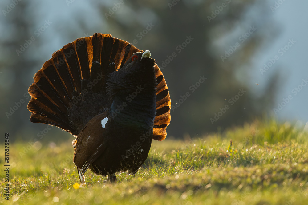Western capercaillie male lekking on the grass meadow in morning backlight with a tree in the background, showing his tail feathers wide spread. Tetrao urogallus, Slovakia, wildlife.