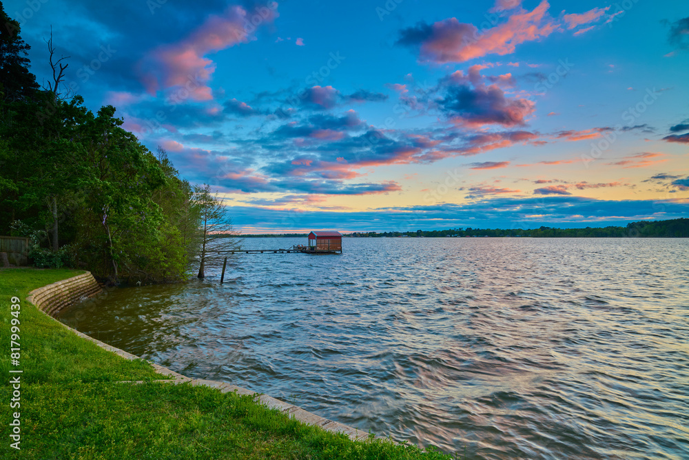 Boathouse on Lake Tyler, Texas with colorful clouds.