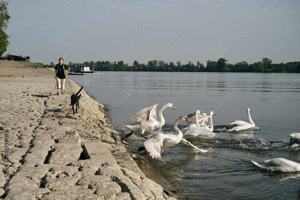 A black mix breed dog runs along the river and scares the swans. The hunting instinct of a domestic dog. Female owner walks behind without leash. Belgrade, Zemun district. Embankment of Danube River.
