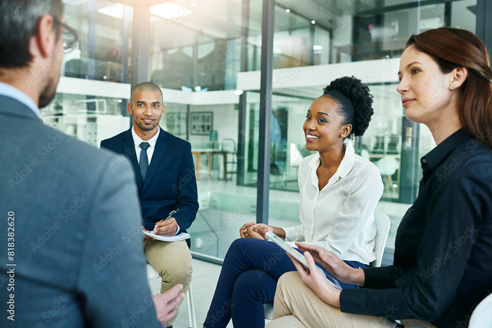Meeting, office and businesspeople for discussion with teamwork for job with collaboration conversation. Corporate, planning and diversity with marketing strategy for finance in accounting firm.