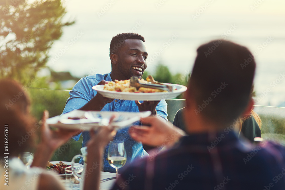 Group of friends, food and eating at outdoor restaurant for summer vacation, celebration or rooftop party. Drink, diversity and happy people by table for brunch, meal or bonding together in Miami