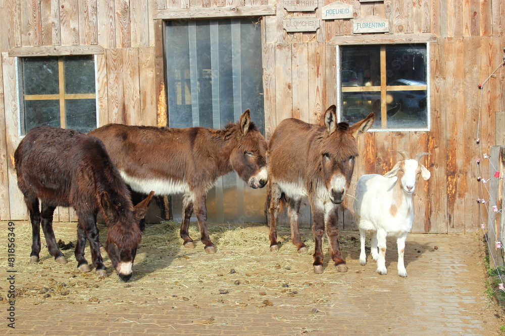 Esel und Ziege auf einem Bauernhof vor einem Stall