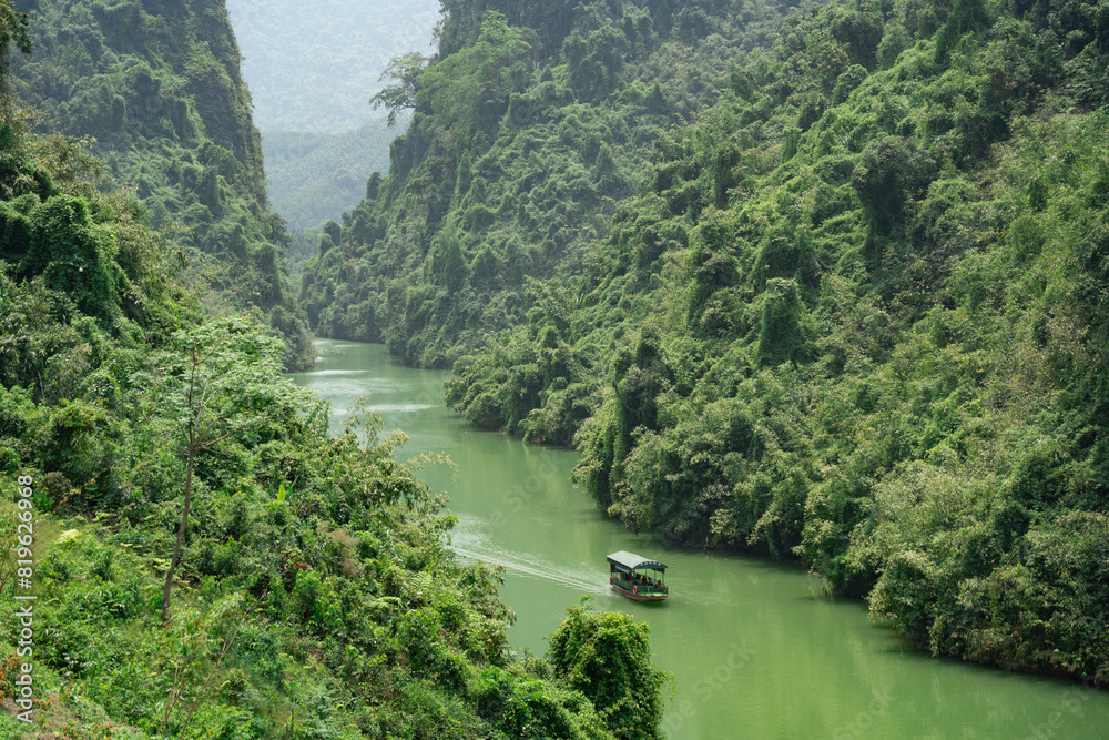 Boat on river in Cat Ly Camping, Ha Giang loop, North Vietnam