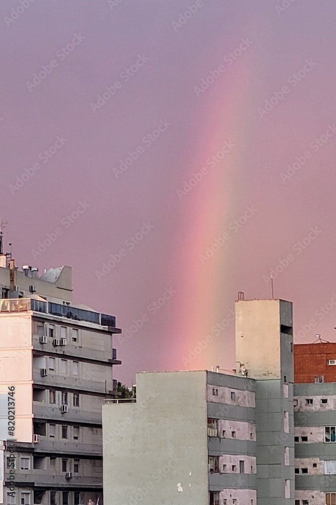 Arcoíris en un cielo azul, con tonalidad de rosado que sale entre los edificios del Barrio de Pocitos en Montevideo Uruguay.