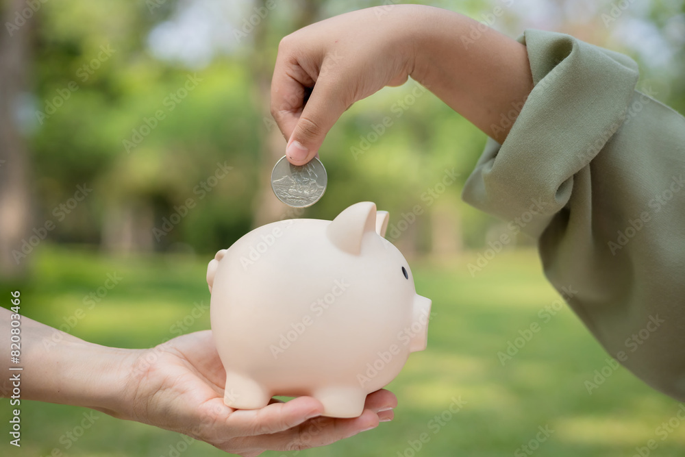 little girl puts a coin in a piggy bank money savings concept