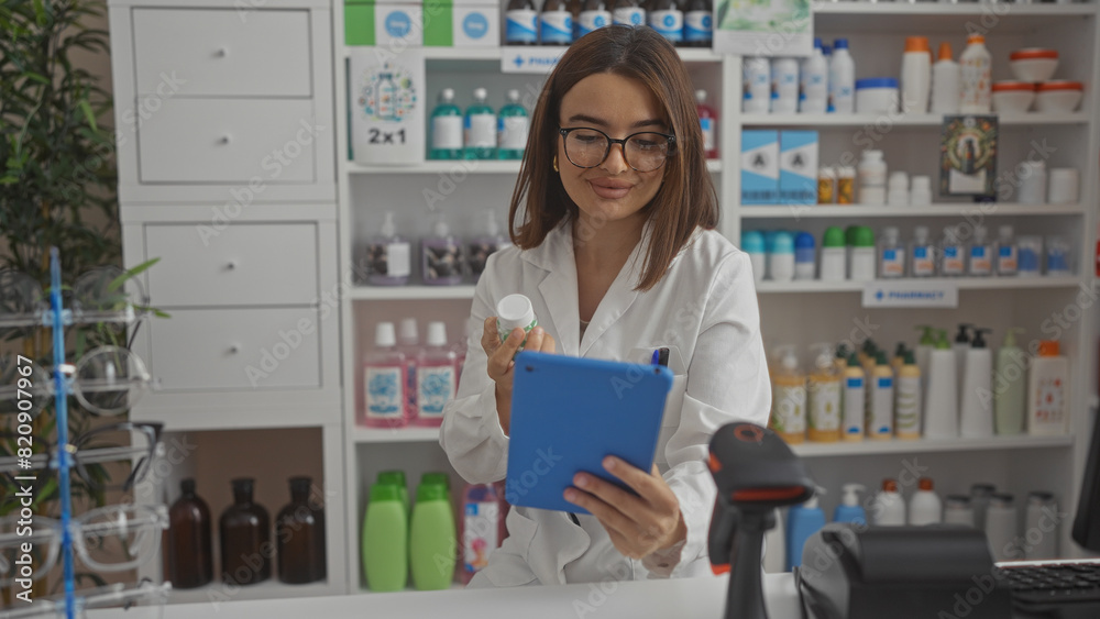 A young hispanic brunette woman wearing glasses in a white coat at a pharmacy, holding a bottle and looking at a tablet indoors.