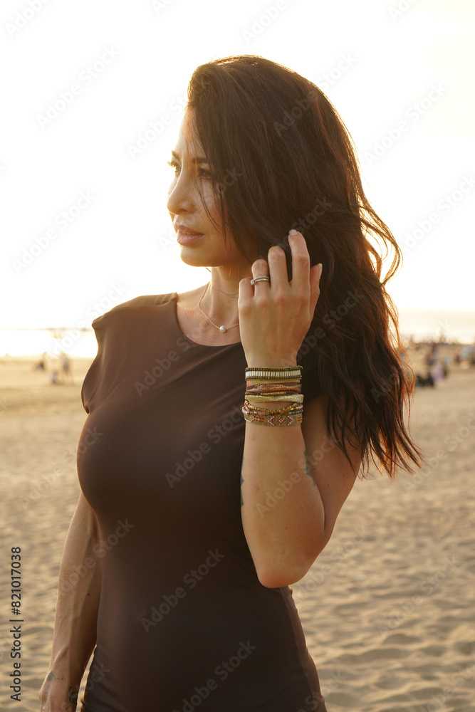 Summer radiance: Beautiful brunette posing on the beach at sunset