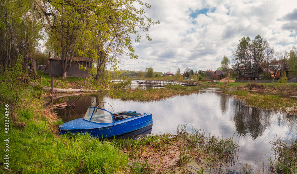 Green summer landscape, a vintage boat tied to the shore of a pond