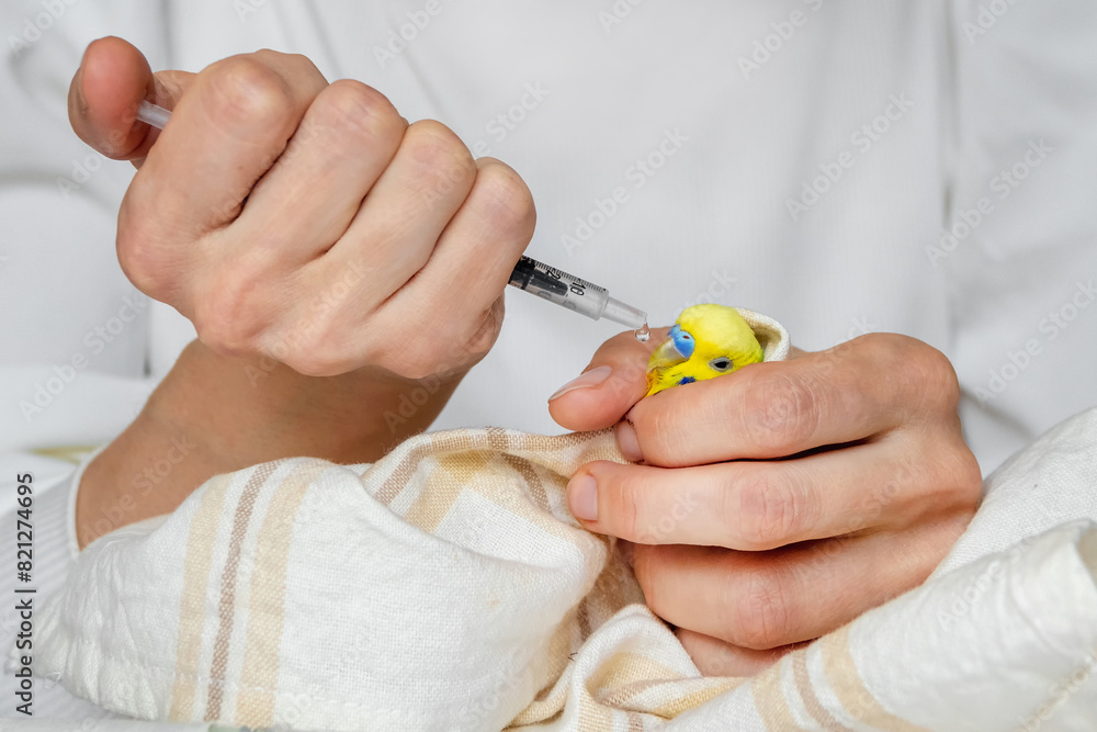 Yellow budgie in the hands of a doctor. Cure parrot