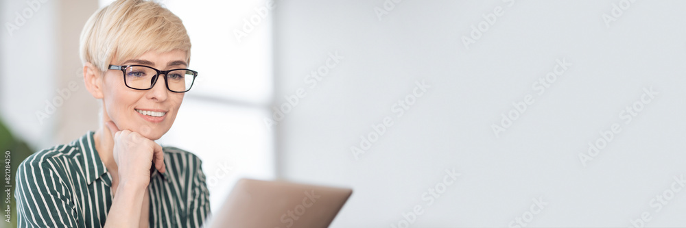 Happy Businesswoman Reading Business News On Digital Tablet Computer Sitting In Modern Office. Selective Focus, Copy Space