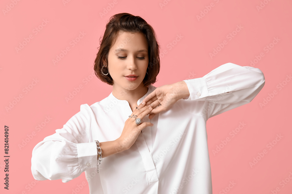 Beautiful young woman wearing stylish silver jewelry on pink background