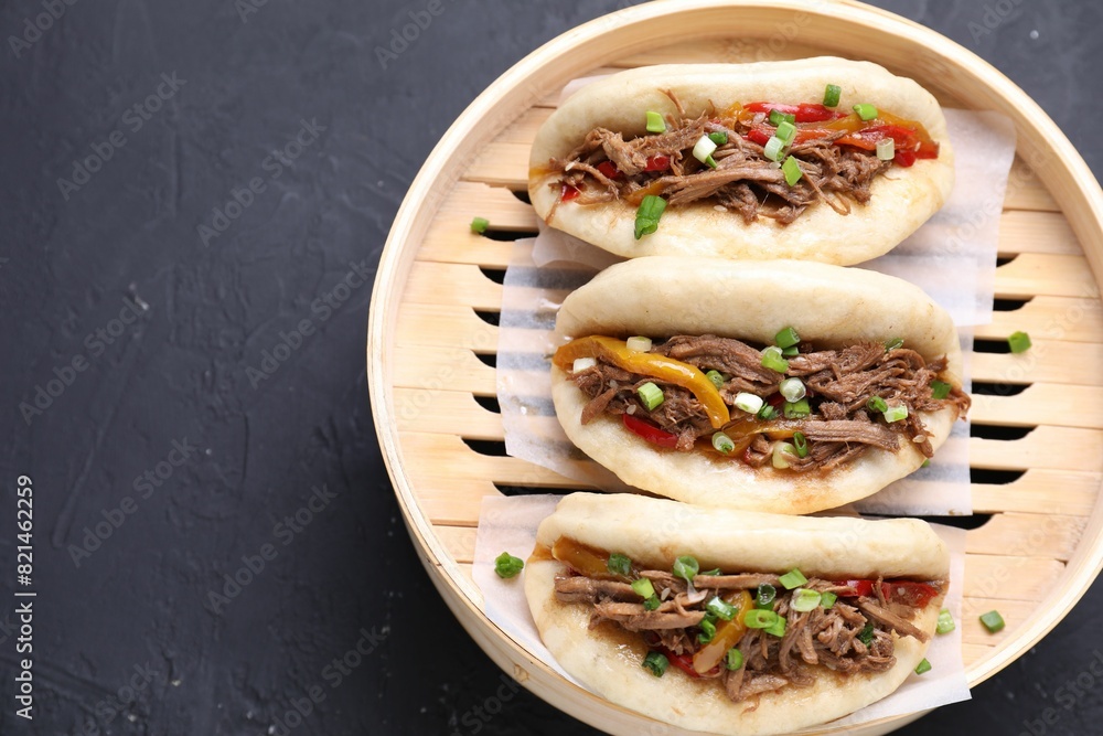Delicious gua bao in bamboo steamer on black table, top view. Space for text