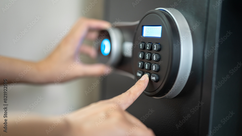 Action of people hand is unlocking to open the safe box door by pressing password on the number panel. Close-up and selective focus.