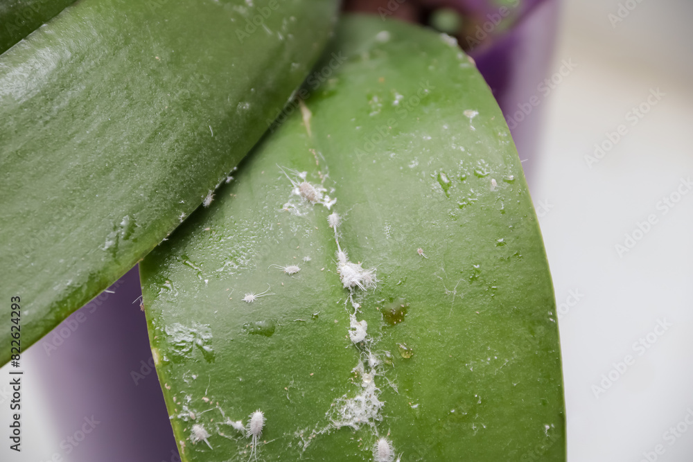 a long-tailed mealybug - Pseudococcus longispinus (Pseudococcidae) on an orchid sticky leaf. infected orchid flower, pest control concept