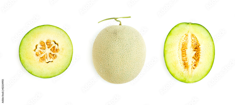 Cantaloupe melon cut in half isolated on white background, Green melon