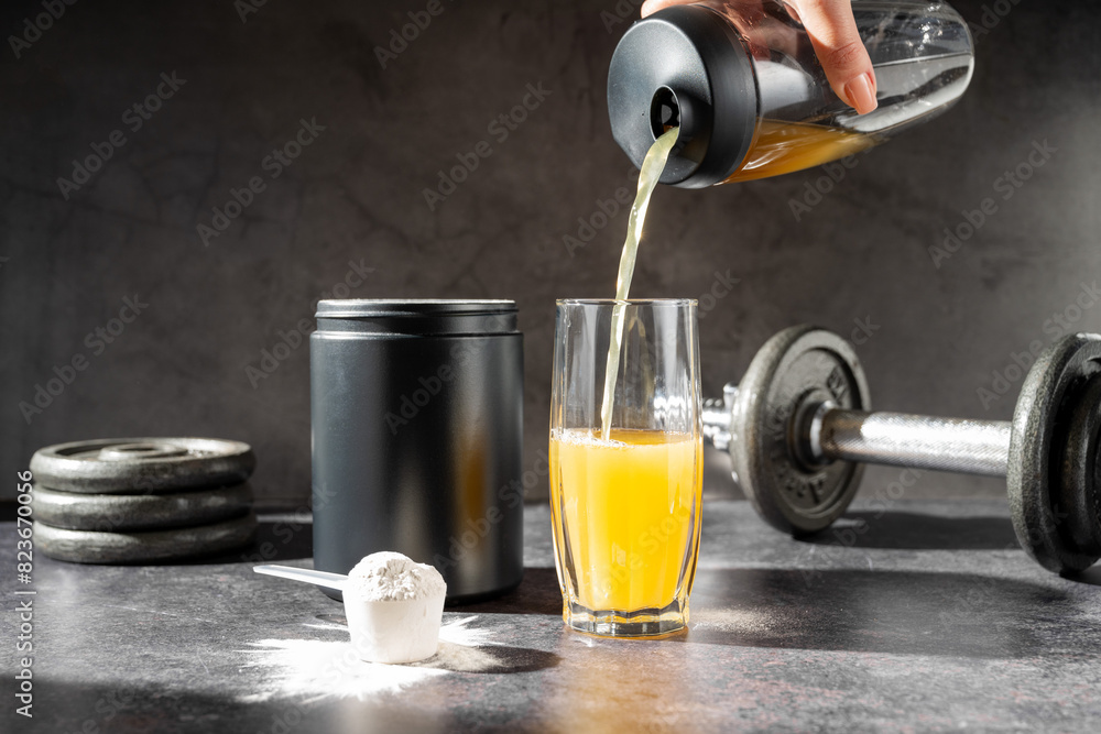 Amino acid food supplement, creatine with orange flavor in a measuring scoop, Sports nutrition