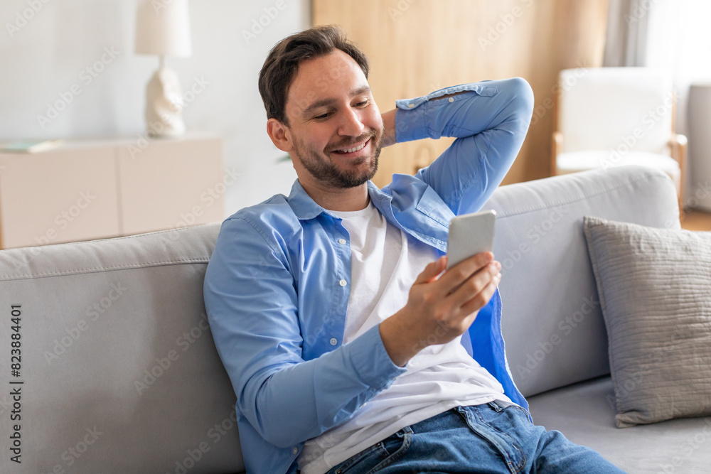 A man is sitting on a couch indoors, engrossed in using his smartphone. He is focused on the screen, tapping and swiping. The room is dimly lit, with soft ambient lighting.