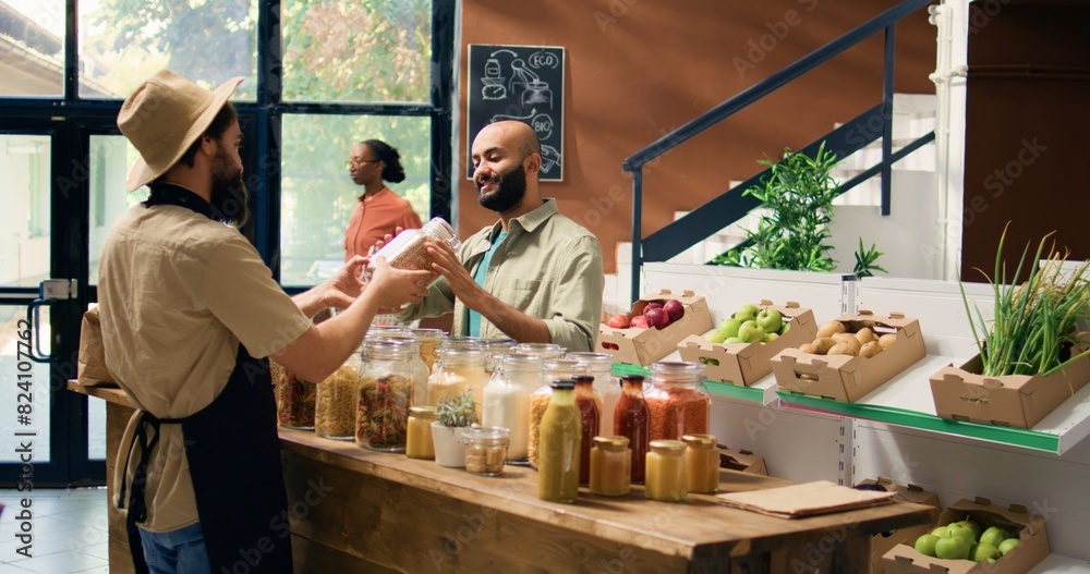 Local farmer presents ripe vegetables to client in zero waste eco store, selling freshly harvested organic produce from garden. Man looking at locally grown bell peppers, sustainable lifestyle.